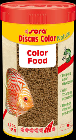 A sera Discus Color Nature a színezékek és tartósítószerek nélkül, lágy szemcsékből álló eleség minden diszkoszhal számára.