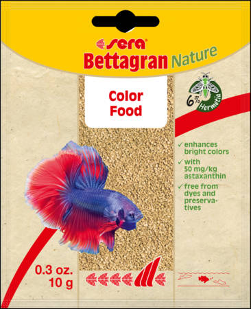 Sera Bettagran Nature a könnyen emészthető, színezék, színezékek és tartósítószerek nélkül, olyan akváriumi halak számára, mint a Betta.