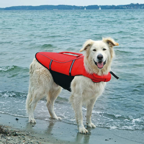 Színe önmagában is feltűnő, ráadásul fényvisszaverő csíkok javítják az észrevehetőséget. A hátán lévő fogantyúval a kutya könnyebben kiemelhető a vízből.
